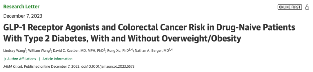 在这项研究中,研究团队分析了美国50个州59个医疗组织中超122万名2型糖尿病患者,无论是否肥胖,基线时没有患结直肠癌,将GLP-1受体激动剂与7种非GLP-1受体激动剂抗糖尿病药物进行比较,分析了GLP-1受体激动剂对2型糖尿病患者患结直肠癌风险的影响。7种非GLP-1受体激动剂抗糖尿病药物包括:胰岛素、二甲双胍、α-葡萄糖苷酶抑制剂、二肽基肽酶4(DPP-4)抑制剂、钠-葡萄糖协同转运蛋白2(SGLT2)抑制剂、磺酰脲类和噻唑烷二酮类药物。